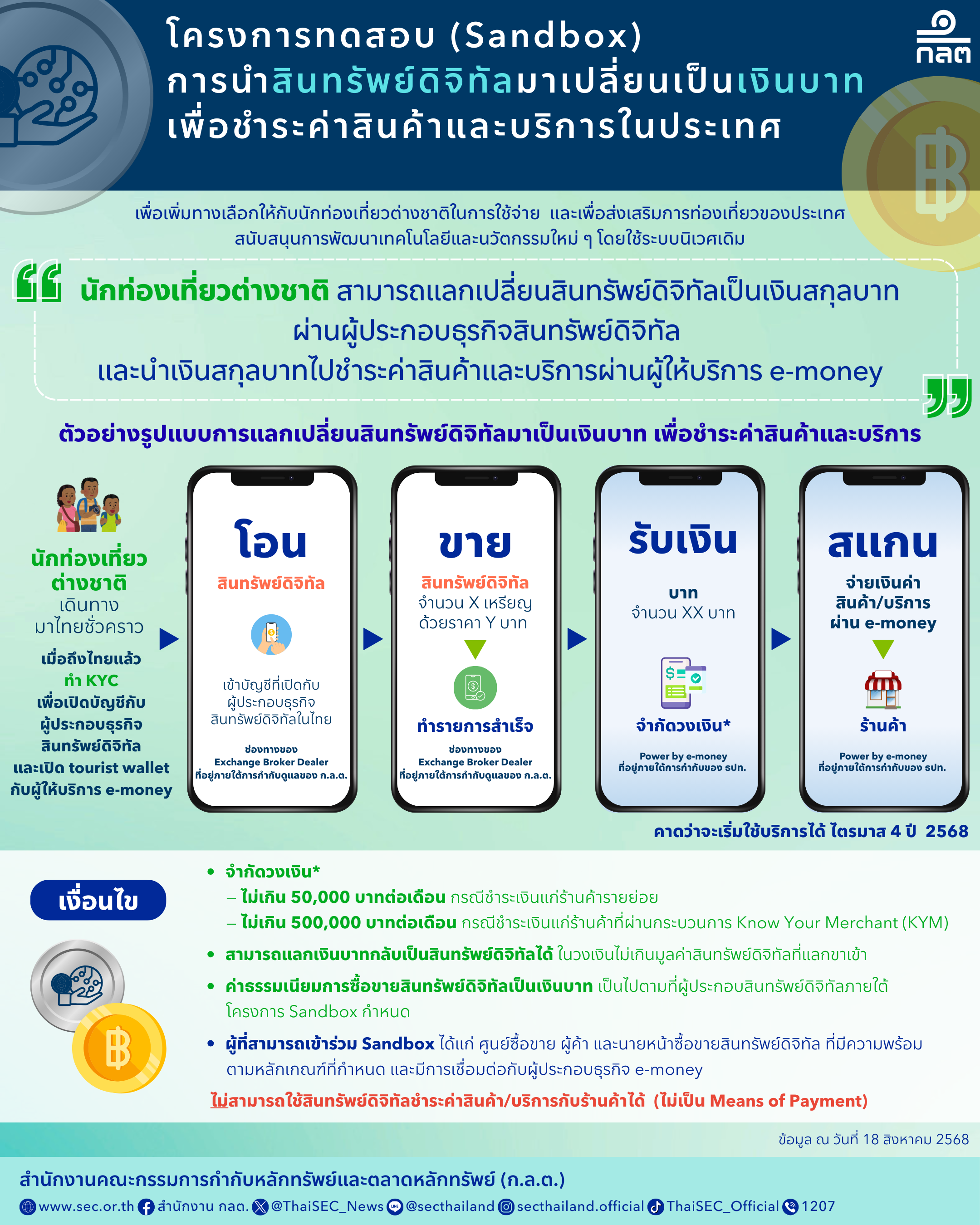ท่องเที่ยวของประเทศ โดยเพิ่มทางเลือกและความสะดวกของนักท่องเที่ยวต่างชาติที่ถือครองสินทรัพย์ดิจิทัล มาแลกเปลี่ยนเป็นเงินบาทเพื่อนำไปใช้จ่ายในประเทศไทยผ่านระบบ e-money ได้ ซึ่งผู้ประกอบธุรกิจที่ได้รับความเห็นชอบจะมีระยะเวลาทดสอบภายใน 18 เดือน ทั้งนี้ ยังคงมีการป้องกันความเสี่ยงที่เกี่ยวข้องอย่างเหมาะสม